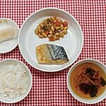 ご飯 さばの味噌煮 五目煮豆 ほうれん草とえのきのすまし汁 くだもの