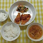 ご飯 チキンカツのおろしあんかけ ごまじゃこサラダ きのこの味噌汁 杏仁豆腐