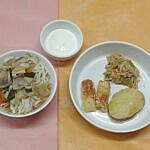 豚丼 フライドポテト(のり塩) ブロッコリーの中華和え 厚揚げ・チンゲン菜・まいたけのスープ 杏仁豆腐
