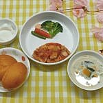 パンプキンパン 鶏肉のトマト煮 温野菜サラダ 豆乳スープ 杏仁豆腐